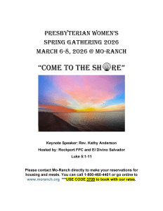 Spring Gathering 2026 Presbyterian Women of Mission Presbytery Spring Gathering @ Mo Ranch Keynote: Rev. Kathy Anderson Share this: Share on X (Opens in new window) X Share on Facebook (Opens in new window) Facebook Like Loading... Share this: Share on X (Opens in new window) X Share on Facebook (Opens in new window) Facebook Like Loading...